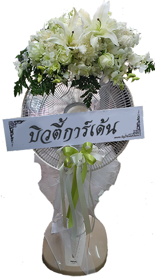 W 81 : พวงหรีด พัดลม 16นิ้ว ประดับดอกไม้